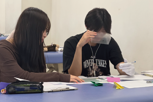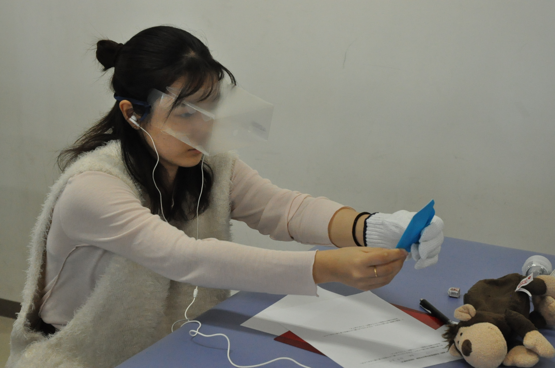 軍手越しでは紙の端がつかみにくく、ゴーグルで視界が狭まると指の位置が見えづらい。集音器を通すと、友達の声よりも椅子を引く音や咳の音が大きく聞こえ、集中することができません。