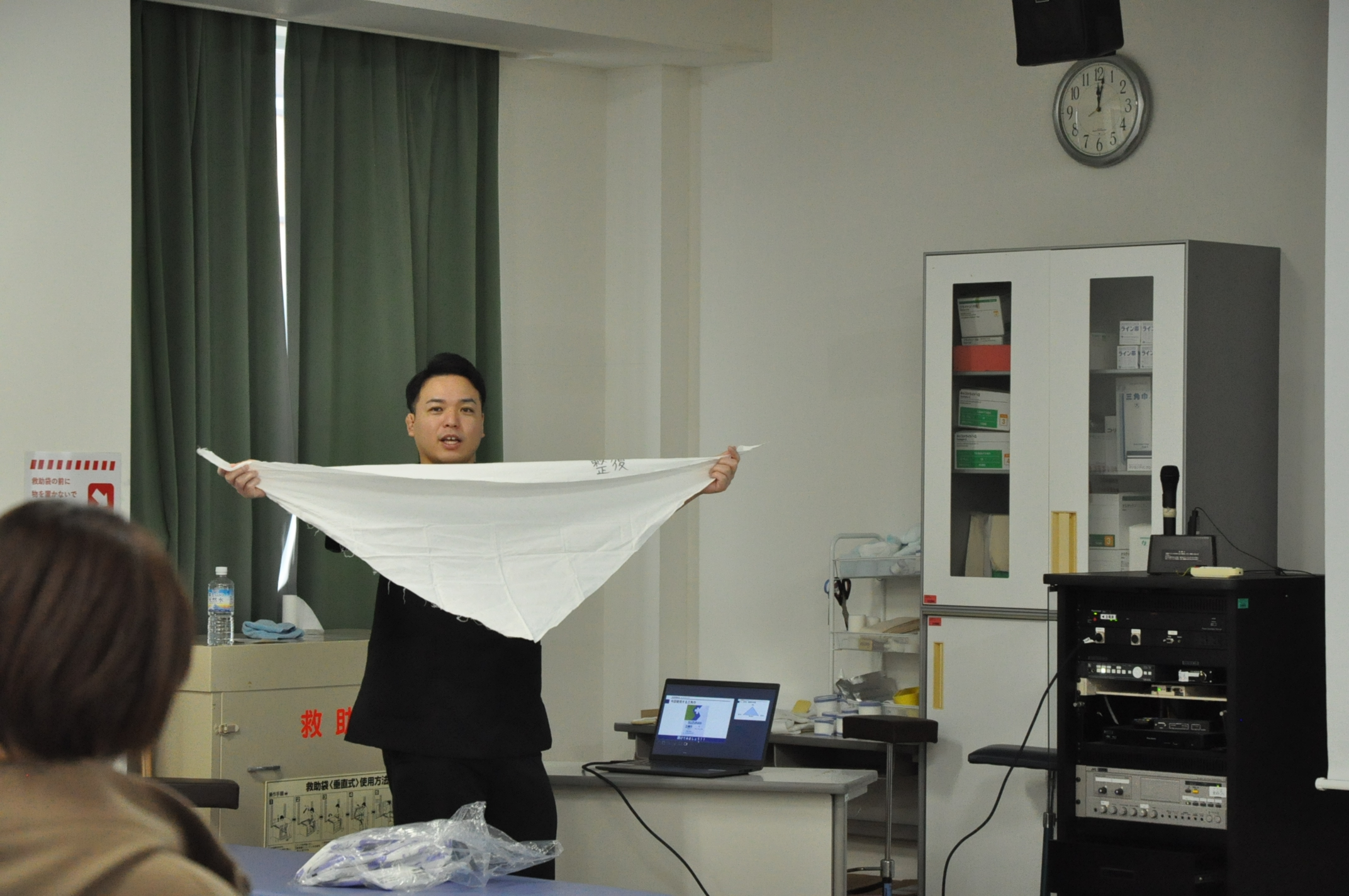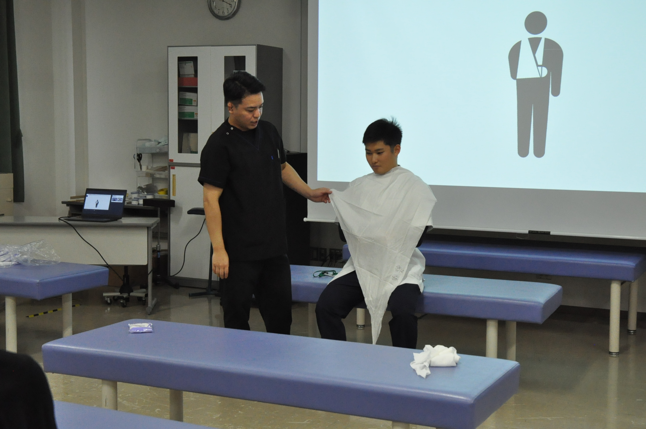 スポーツ現場や日常生活で起こり得るケガをテーマに、三角巾による応急処置を体験。