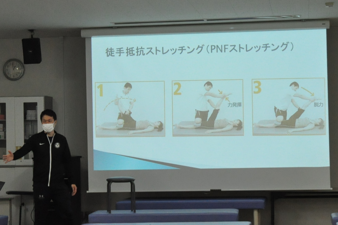 ストレッチングや身体のコンディショニングを中心に、選手サポートの基礎を体験。