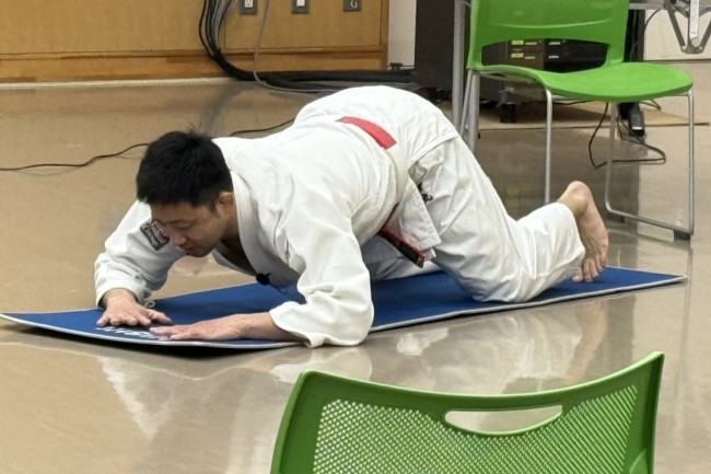 今回の教室では、柔道の受け身や体の使い方を応用した、