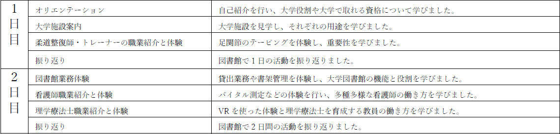 生徒さんは大学教員や学生との交流を楽しみながら、真剣に取り組む姿勢を見せていました。理学療法士、柔道整復師、看護師といった医療職の体験を通じて、自身の将来について考える貴重な機会となったようです。
